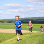 etwa 350 Meter pro Runde auf dem Sportplatz. Unterstützt durch lautstarke